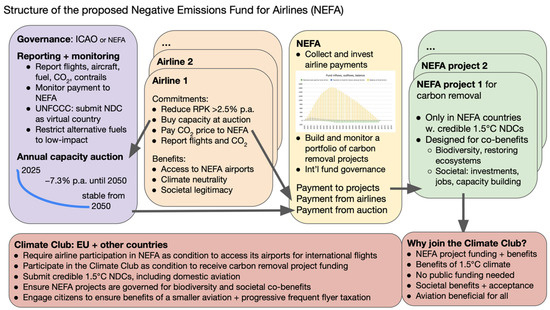 NEFA might be much more acceptable to all aviation stakeholders if they could self-manage the system and its main components: cap and trade reducing available passenger-km by 7.3% p.a. including annual rights auctions; airline-level reporting rules, payments, and set a minimum target of 2.5% p.a. for flight reductions; reporting, regulation, and perhaps even a reward for airlines for avoiding contrail-forming zones; and finally access to airports only for those airlines participating in NEFA, and negative emissions funding access only for countries participating in NEFA to access its airports. Like CORSIA, this could be managed by ICAO with support from IATA and the Air Transport Action Group, which would limit the role of national states to setting the rules and objectives, and auditing the process and accounts (Figure 4).