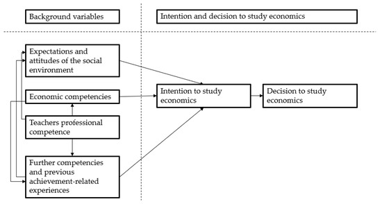 Prior achievement-related experiences, e.g., school grades, also influence students’ intention to study economics. In this regard, it is important to note that, theoretically, this effect is mediated by students’ individual interpretations of these experiences as well as the expectations of their social environment. These causal interrelations can be directly derived from EVT and are represented on the left side of the model (see Figure 1).