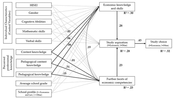 To answer the research question, different analyses are performed. In the first step, descriptive and bivariate analyses serve as a basis to gain an understanding of the distribution and bivariate interrelations between the different variables within the model. In the second step, a path model is calculated based on the theoretical assumptions. The different hypotheses are systematically tested following these analyses. In the path model, the professional knowledge that students perceive in their economics teacher is modeled as the independent variable. Additionally, economic competence and study aspirations are modeled as mediators between students’ perceptions of their economics teachers’ professional knowledge and the choice of an economics study program (dependent variable). Students’ mathematical and verbal skills, cognitive abilities, school grades, gender, socio-economic background, and advanced school course are modeled as control variables. Because of strong interdependencies between the further facets of economic competence and the complexity of the path model, these were modeled as one dimension. Therefore, the complexity of the model could be significantly reduced. WLE estimators for economic knowledge and skills, mathematical and verbal skills, and cognitive abilities were standardized by a mean of zero and a standard deviation of one.