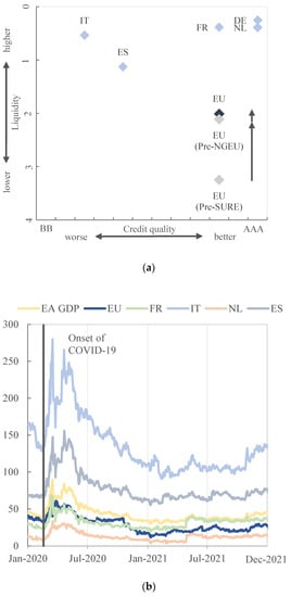 Credit risk indicators for EU bonds. (a): Scatterplot of market liquidity (average bid–ask spreads in basis points) vs. credit quality (minimum rating). Arrow origins refer to September 2020 (“Pre-SURE”) and May 2021 (“Pre-NGEU”). Arrow endpoints and all other diamonds refer to October 2021 (Post-NGEU’s first auction). Higher liquidity corresponds to tighter bid–ask spreads. The rating score on the horizontal axis is calculated from minimum issuer ratings across S&P, Moody’s, Fitch, and DBRS. (b): Ten-year yield spreads over German Bunds, in bps, between January 2020 and December 2021.