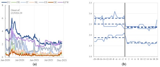 Figure 3a suggests that EU bonds’ bid–ask spreads decreased substantially over time, from initially high levels between 4 and 6 bps in early 2020, to approximately 2 bps by December 2021, approximately to the level of Spanish sovereign bonds’ and German KfW agency bonds’ bid–ask spreads.
