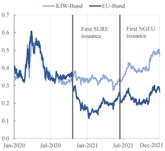Monfort and Renne 2014.) Both time series evolve almost identically up to the first issuance of EU SURE bonds on 20 October 2020. EU bonds’ total market volumes, and, therefore, their expected trading volumes as well, increased considerably following each SURE and NGEU issuance date. The divergence between the two yield spreads, particularly following the first SURE bond issuance, suggests that investors adequately incorporated the improved liquidity conditions into the yields of EU bonds.