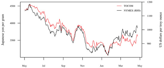 Our raw data consists of 1 min best bid and ask quotes and traded volumes for the April 2016 expiration platinum futures contracts traded on NYMEX and TOCOM. Data for the NYMEX contract were obtained from Thomson Reuters (now Refinitiv), and those for the TOCOM contract were obtained directly from the exchange. The data begin at 9:00 a.m. Japan Standard Time (JST) on 7 May 2015 and end at 4:00 a.m. JST on 23 April 2016, containing 264 trading days and 223,650 1 min observations.