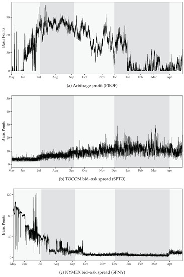 Arbitrage profit and liquidity variables. (Note: The figure shows the 5 min of average arbitrage profit (PROF) and the relative bid–ask spreads for the NYMEX (SPNY) and TOCOM (SPTO) contracts calculated from 1 min data for 264 trading days starting at 9:00 a.m. Japan Standard Time (JST) on 7 May 2015 and ending at 4:00 a.m. JST on 23 April 2016 in basis points in panels (a–c), respectively. The shaded regions indicate the five subsamples).