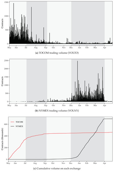 Figure 3 shows the number of platinum futures traded during each 5 min period over the full sample for TOCOM (VOLTO) and NYMEX (VOLNY) in panels (a) and (b), respectively. Panel (c) provides a cumulative sum of the trading volume in the April 2016 contract on each exchange. This shows the different pattern in trading volume over the lifespan of the contracts on each exchange. The TOCOM April 2016 contract is most actively traded when it is the far contract, while the NYMEX contract is most active when it is within the nearest four contracts.