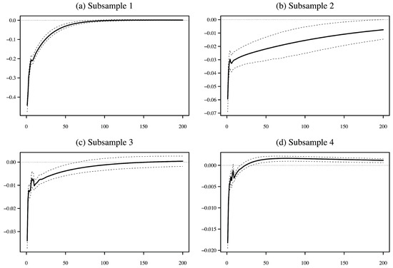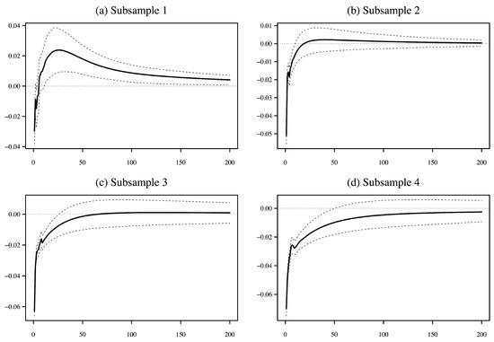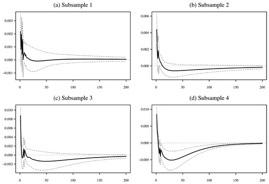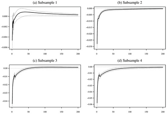 Plots of the GIRFs derived from the VAR model are presented in Figure 4, Figure 5, Figure 6, Figure 7, Figure 8 and Figure 9, organized as single impulse response pairs shown for each of subsamples 1–4 in panels (a–d), respectively. The GIRFs are shown for 200 steps ahead with 90-percent confidence intervals bootstrapped using 200 iterations. Note that 50 steps ahead represents just over 4 hours of trading time.