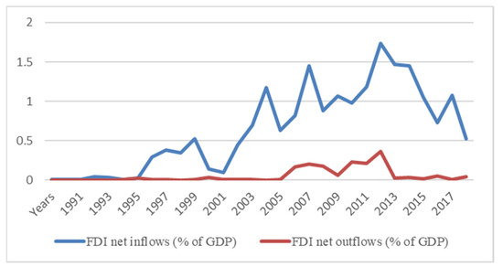 This study’s main independent variables are the decomposed measure of the foreign direct investment (FDI), indicating the inward and outward FDI flows. The net direct investment at a specific period, which is typically the end of a quarter or a year, is measured by FDI stocks. However, the value of the resident investors’ equity in and net loans to businesses in other countries comprise the outward FDI stock. On the other hand, the value of the foreign investors’ shares in and net loans to domestically based businesses constitute the inward FDI stock. These two measures of the FDI help augment the scale of an economy’s domestic investment employment (Türkcan 2008). In addition, economic development is, in general, economic growth. However, it is not just about increasing the total output; it is also about the fundamental transformations of an economy, including its sectoral organization, demographics, and geographic makeup, but perhaps more significantly, its entire social, economic, and institutional structure. Therefore, it is crucial to consider the political, social, investment, and demographic aspects of an economy (Acemoglu 2012).