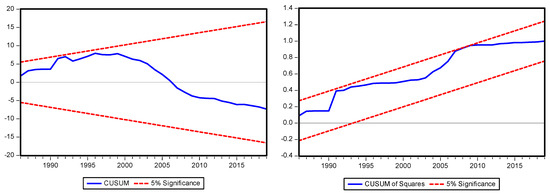 This study utilizes the CUSUM and CUSUM square tests in order to check the stability of the model (Figure 2). The values of the residuals are marked with blue lines, while the red lines indicate the confidence levels. The estimated graphs confirm that the ARDL model is stable, as the residuals’ investigated values remain within the confidence lines at a 5% significance level.