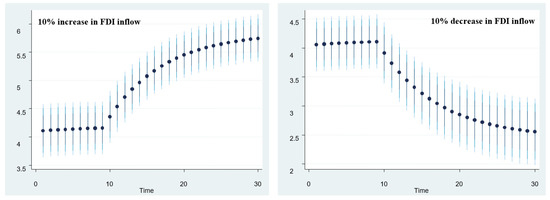 Inward FDI flows and domestic investment. The above graphs portray ±10% in the inward FDI flow and its impact on domestic investment. The dots depict the average prediction value, while the dark blue to light blue lines indicate 75%, 90%, and 95% confidence interval, respectively.