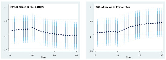 Figure 4 illustrates a 10% positive and negative impact of the outward FDI flow on the domestic investment in Bangladesh. Both of these graphs indicate that positive and negative shocks demonstrate positive effects in the short run and in the long run. Still, the negative shock shows that the impact of the outward FDI flow decreases with adverse changes in the long run.