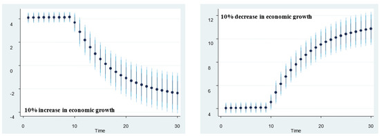Figure 5 represents a 10% positive and negative change in the economic growth and its impact on domestic investment in Bangladesh. The first graph relating to the economic growth shows that a 10% change has a positive effect in the short run and a negative impact in the long run. The second graph divulges that a 10% decrease indicates that the economic growth has a positive effect both in the short run and in the long run. Still, in the long run, the negative shock demonstrates that the economic growth decreases with positive changes.