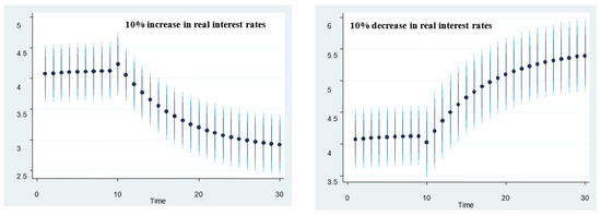 Real interest rate and domestic investment. The above graphs portray ±10% in the real interest rate and its impact on domestic investment. The dots depict the average prediction value, while the dark blue to light blue lines indicate 75%, 90%, and 95% confidence interval, respectively.