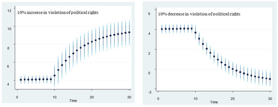 Figure 7 depicts the impact of positive and negative changes in the violation of political rights on the domestic investment in Bangladesh. The first graph shows that a 10% positive increase in the violation of political rights has a positive effect both in the short run and in the long run. In comparison, a 10% adverse change indicates a positive impact in the short run and a negative effect in the long run. This effect on the domestic investment increases with adverse changes in the long run.