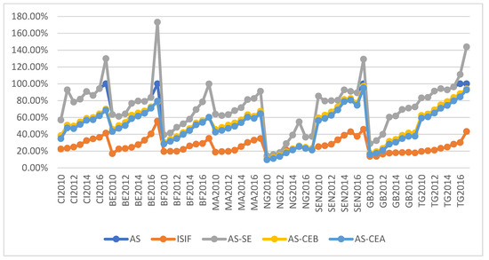 Let us recall that our study had the following objectives. First, we aimed to compute the aggregate scores (ASs) of financial inclusion of the eight economies of WAEMU for 2010–2017, rank them according to their performance, and compare our findings to the ones obtained using the ISIF scores. In addition, we wanted to perform a benchmarking analysis of the countries. Our third objective was to analyze the optimal aggregation weights obtained through DEA to further understand further which of the ten (10) indicators contribute the most to the country’s performance. Therefore, we solved the CCR DEA models designed in the previous section. Furthermore, since we intend to rank the countries, and knowing that the basic DEA models do not always discriminate strongly against the DMUs, we have also run three post hoc DEA models, namely, the super-efficiency, the benevolent cross-efficiency, and the aggressive cross-efficiency models. Our findings are summarized below.
