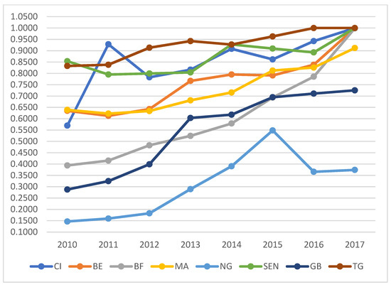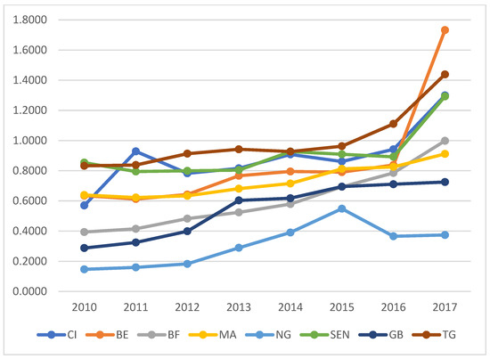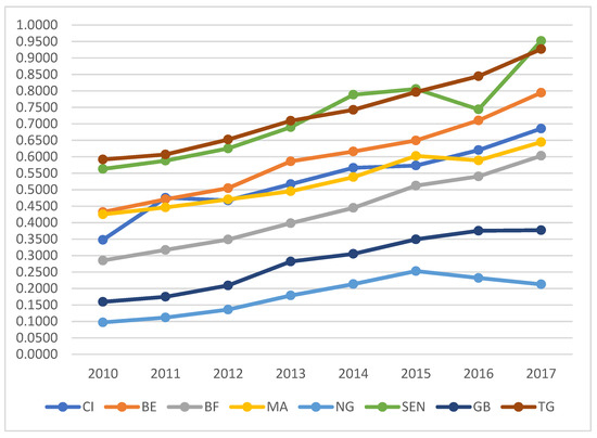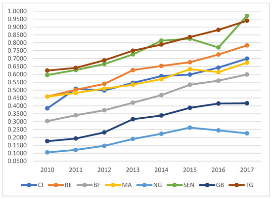 From Table 1, one can observe that from 2010 to 2017, overall, the level of inclusion in the Union has increased on average consistently every year. The situation is much more heterogeneous at the level of each of the economies. They experienced increased financial inclusion between 2010 and 2015 but at different rates. From 2015 to 2017, five of the countries (Benin, Burkina, Ivory Coast, Mali, and Togo) continued their steady improvement; Senegal took a dip in 2016, which it has recovered from since, while the Niger and Guinea-Bissau saw slight deteriorations in both 2016 and 2017.