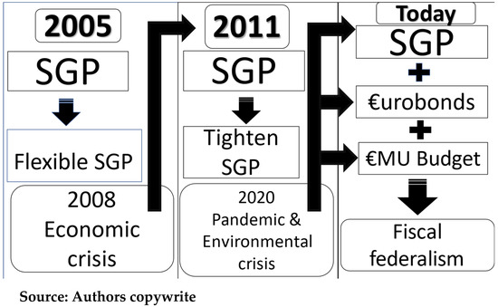 Fiscal discipline is, over time, the most important macroeconomic problem faced by national governments (Alesina et al. 1998), with negative effects on public spending and corporate investment (Alesina et al. 2002). Previous researchers argue that fiscal sustainability is necessary for long-term economic growth in the EMU. This means that the 2005 reform of the SGP (Figure 1) through higher structural deficits, could decrease the scope of anticyclical fiscal actions in the Eurozone (Mackiewicz 2007), reminding that the Greek government could not implement countercyclical fiscal expansion to mitigate the economic recession of 2008, not only due to the asymmetric economic cycle but also due to high and permanent fiscal deficits, which led to fiscal instabilities (Pagoulatos 2020). Regarding the effectiveness of fiscal stability, many economists argue that countries with higher government expenditure and sovereign debt have lower long-term economic growth (Furceri 2007) due to crowding out. Furthermore, the fiscal expansion for public investments, or in other words the “golden rule of public investments”, which allows a government to run public investment-oriented fiscal deficits, leads to lower balanced growth path in the long run (Minea and Villieu 2009) as a result of the lower effectiveness of public investment against private investment. Similarly, tight fiscal rules and enhanced fiscal supervision could mitigate not only fiscal expansion and crowding out, but also irrational behavior (e.g., moral hazard) (Tsiddon 1992). Many economists have an opposing view and argue that the advantages of the Eurozone’s fiscal federation would be modest (Fatás 1998), since budgetary consolidation in EMU countries is essential (von Hagen et al. 2001), as there is a widely accepted consensus that the EMU economic stability is based on sustainable public finances of national governments. Finally, markets seem to reward national governments for fiscal consolidation (Mosley 2004), as lending costs are related to fiscal discipline.