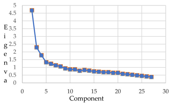 Table 2. The Scree plot is arranged according to total intrinsic values and is used to determine which of the factors are significant and which are not. In principle, an important factor is a factor that has a total intrinsic value greater than 1. In this case, regarding values higher than 1 in the control chart, we achieved the same 7 identified factors (