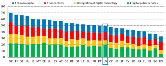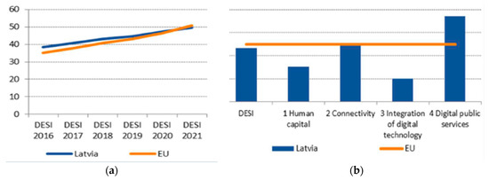 It should be mentioned that the ranking of Latvia used to be constantly higher than the European average, but recently it has started to lag, despite the obvious progress in development (Figure 2a). At the same time, the digitalization of public services in Latvia is one of the highest among the countries of the European Union. However, the areas of integration of digital technologies and human capital fall significantly behind the European average (Figure 2b).