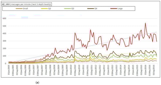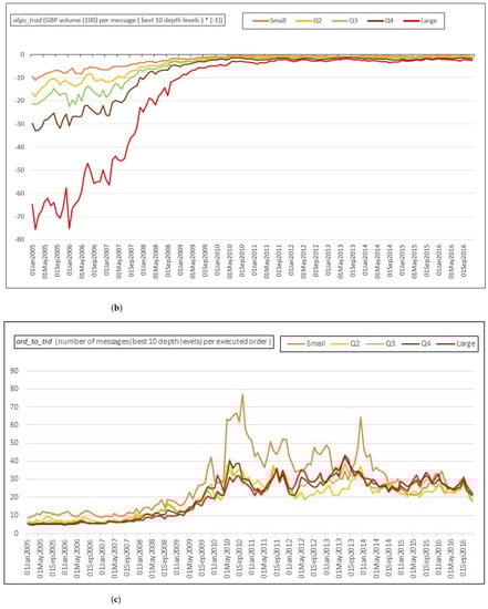 Let us imagine that there are two different stocks, 1 and 2. For stock 1, the value of is and that for stock 2 is where . Let us imagine again, for any stock, the value of at time and are and , respectively. For showing a rise in the HFT intensity over time, the condition is < . On the contrary, for the same comparison across stocks (let us say intensity of HFT in i is higher than that of j), the condition should be > , i.e., the opposite. This difficulty of comparison makes the proxy less attractive in different scenarios. For example, we refer to Figure 3b to illustrate the theoretical interpretation issue. An intensive growing tendency of the electronic message rate (a decreasing trend of the absolute value of the proxy) can be noted across all quintiles over the sample period, and the pattern confirms the condition we set, < , accordingly. Again, in the same figure, the quintiles (large) showing the highest HFT intensity lie at the bottom of the groups (the lowest absolute value of the proxy), i.e., > . This explanation confirms that the cross-sectional and time-series comparison is somewhat dubious for the proxy .