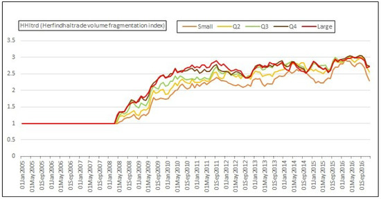 where is the square of the trading volume share on venue j among n, for security i at day t. This is a normalized measure that ranges from 1 to n, where 1 stands for no fragmentation or full concentration in the primary venue, and n for evenly distributed order flow across n exchanges. Since our study considers one primary venue (LSE) and three alternative exchanges, the range is . The trading volume of all stocks, on average, has fragmented across the venues over the past. We find that the average has increased from 1 in 2005 to 2.89 in 2016 (Figure 4). It may be noted that the market was concentrated before 2007, and the proxy takes the value 1 accordingly.