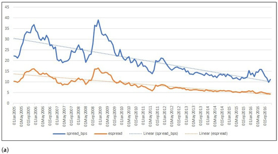 where is an indicator variable that equals if the intraday trade is a liquidity demander’s buy and if the trade is a liquidity demander’s sell, is the trade price, and is the quote midpoint prevailing at the time of the trade. Finally, all intraday effective spreads are weighted by their trade volume to convert them into a daily measure. For clarification, a narrower effective spread is associated with a higher liquidity and vice versa.