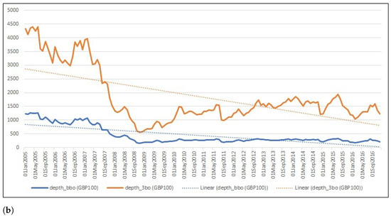 During the period 2005–2006, both quoted spreads and effective spreads reveal substantial improvement of liquidity in the market (see Figure 5a). For instance, overall quoted spreads decreased more than one-half and dropped to 13.5 bps (approx.) at the end of 2016 compared to 30 bps (approx.) in 2005. The effective spreads also decreased to approx. 4 bps compared to approx. 10.7 bps in 2005. Figure 5b shows that both depth measures of liquidity declined over the years significantly. It would seem surprising if one interprets this movement as liquidity degradation. We rather argue that the decline in depth might be attributable to the narrowed depth as market makers have less incentive to offer a larger depth that is usually done for a wider spread. The rising HFT intensity during the sample period is also linked to the decreasing trade sizes. HFT is generally performed in small lots, and it prominently uses slice-and-dice strategy in executing a large order (Aitken et al. 2017; Gresse 2017; Hendershott et al. 2011).