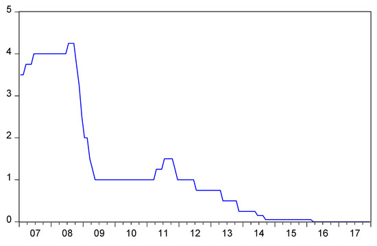 Responding to the global economic and sovereign debt crisis, the ECB announced and implemented conventional and non-conventional monetary policy measures to improve bank funding conditions, strengthen lending to the business sector, and support financial activity. More specifically, from the beginning of the financial crisis, the ECB rapidly reduced its key interest rates to the zero bound level. As shown in Figure 1, since the last quarter of 2008, the ECB decreased the rate of main refinancing operations from 4.25 to 1%, which then remained flat until April 2011, and after a small increase, it decreased to zero level.