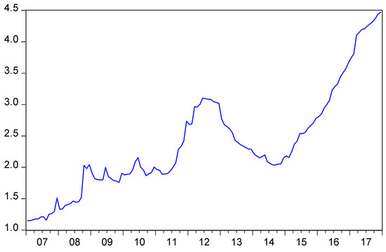 In the third phase of the crisis, starting in June 2014, the ECB launched a credit easing program (CEP), intended to strengthen the transition mechanism of monetary policy. The CEP included two targeted longer-term refinancing operations (TLTROs) of up to four years’ duration, designed to supply funding to euro area banking institutions and the expanded asset purchase program (APP), which includes the acquisition of private and public sector securities from secondary markets.4 Asset purchases under the APP were conducted until December 2018. Boeckx et al. (2017), Moder (2019), and Fiorelli and Meliciani (2019) used total assets of the eurosystem’s balance sheet as a proxy for non-standard monetary measures. As shown in Figure 2, unconventional monetary policy operations resulted in a serious expansion of the ECB’s balance sheet from 1.1 trillion at the beginning of 2007 to 4.5 trillion at the end of 2017.