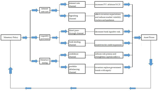Monetary policy transmission channels are not substitutes, and they can work alongside one another. In Figure 3, we show how expansionary monetary policy measures (interest rate cuts, liquidity provision, and monetary easing) can influence asset prices via the main transmission channels. In addition, changes in asset prices can trigger the ECB’s reaction, as in the case of the sovereign debt crisis when Greek government bond yields reached unsustainable levels with a possibility of contamination in Italy, Ireland, Portugal, and Spain. During this period, the ECB established the SMP to help markets calm down by buying public debt bonds from the five stressed countries (GIIPS). Thus, we recognize a cyclical framework operating between monetary interventions and asset prices.
