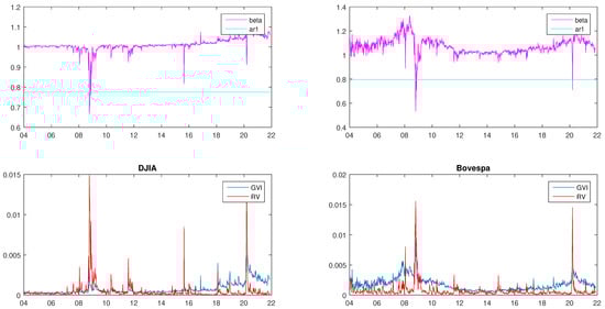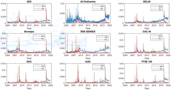 where the vector X i , t contains the realized volatility R V i , t and the corresponding Google data G i , t for the ith market index, and ϵ i , t is a white noise process. We estimate the model with a lag parameter k of up to 10, and we finally select a lag length based on information criteria.