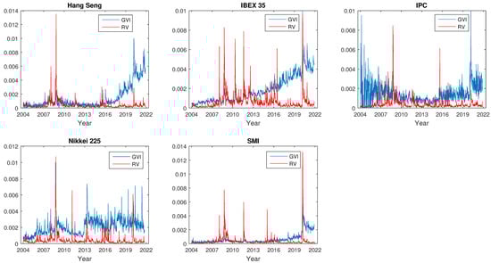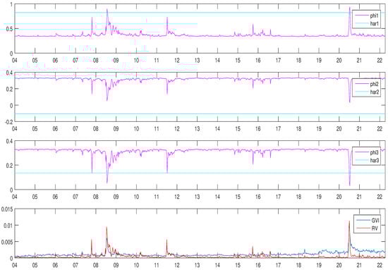 In order to illustrate typical patterns arising from our ES-based model, Figure 3 displays the variations over time of the coefficient estimates and parameters for the AEX index. The three coefficients of the HAR-ES model are relatively stable during low-volatility periods and highly dynamic during high volatility phases. The short-term component ( p h i 1 ) tends to increase when RV rises, putting more weight on the previous level of volatility, and decreases subsequently when RV declines. Inversely, the mid-term ( p h i 2 ) and long-term ( p h i 3 ) components decrease when RV surges and then rise when RV decreases, since prices are expected to return to their fundamental values. Hence, these parameters show rapid adaptation to changes in stock market volatility, which makes the HAR-ES model fairly suitable for volatility modeling. Note that for some indices, we find the same pattern for the short-term and mid-term components but opposite patterns for the long-term component, which could have been caused either by the relatively low frequency of our data or the larger distance between RV and GVI for some indices. After showing that investor attention significantly affects future stock market volatility, it is worth investigating whether GVI improves volatility forecasts.
