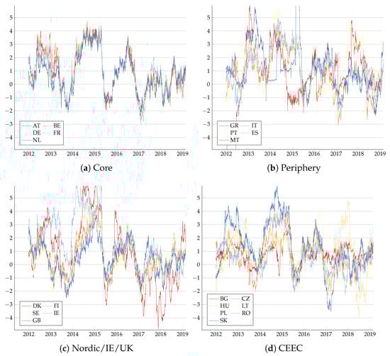 As the Sharpe ratio is our main variable of interest, we plot its evolution over time for the 22 EU countries in our sample in Figure 1. We observe some stylized facts across time and across regions. First, there is a large variation in the Sharpe ratio, ranging from −2.7 to 4.4. Second, for the Core and Nordic/Ireland/UK regions, the evolution over time is quite homogeneous across countries, which is why we use time-fixed effects in our regressions. In the Peripheral and CEEC regions, the variation is much more heterogeneous across countries. Third, the mean over time of the Sharpe ratios is similar for all countries, with 0.39 (Czech Republic) as the lowest value and 1.52 (Ireland) as the highest mean Sharpe ratio.