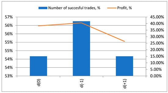To determine whether the detected effects could allow market participants to “beat the market”, the following trading algorithm was used for d(0): sell right at the start of the witching day. Positions should be closed at the end of the witching day. Additional strategies to be tested on d(−1) and d(+1) were as follows: buy right at the start of the day before and after the expiration day, with further closure of these positions at the end of the day.