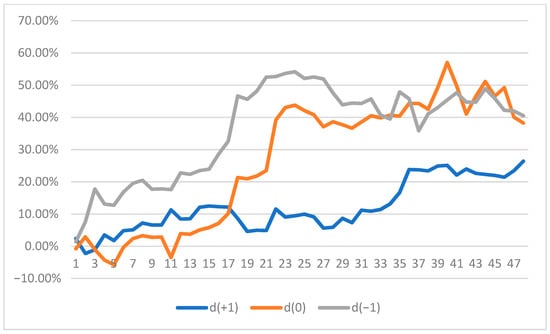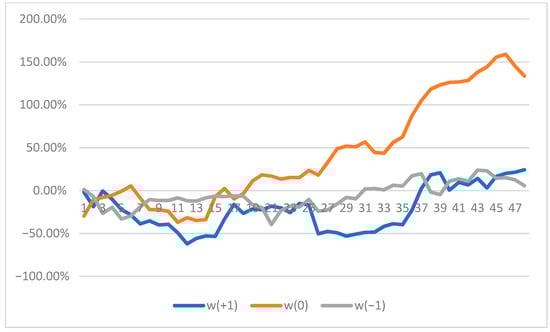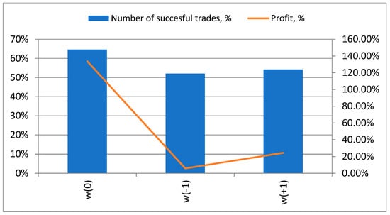 As can be seen, trading strategies based on the week before the expiration day w(−1) and the week after the expiration day w(+1) do not demonstrate results in light of these price effects that are different from random trading. Their inefficiency is confirmed by Sharpe ratios below 1. However, during the week including the expiration day, the number of successful trades was 65%, the results of the simulations were different from those of random trading, and Sharpe ratio was above 1.