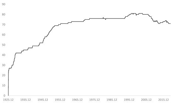 On 2 March 2007, Standard & Poor, the world’s leading index provider, released the list of survivor companies in the S&P 500 index from March 1957 to March 2007. The list is publicly available on the internet.6 Interestingly, only 86 original constitute firms of this well-known market index survived over the past 50 years, which corresponds to 17.20% of the 500 original constitute firms.7 We begin our data collection as follows: (i) use the survivor list of company names; (ii) search the corresponding stock ticker; and (iii) employ the CRSP database to match the stock ticker with corresponding stock returns.8 For these 86 survivor companies, we identified available data associated with 92 stocks. Table A1 in the Appendix A lists the firm names. The number of stocks over time is plotted in Figure 1. Using survivor stocks, we compute an equal-weighted average portfolio denoted as the all survivors portfolio ().9