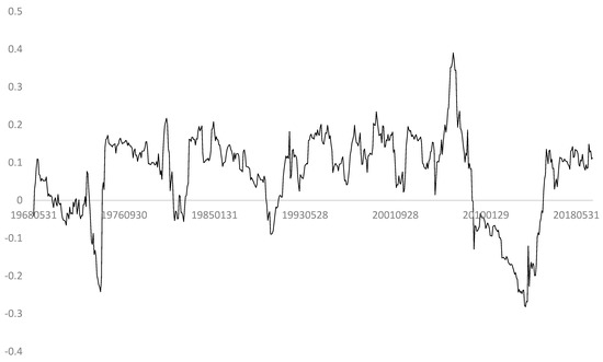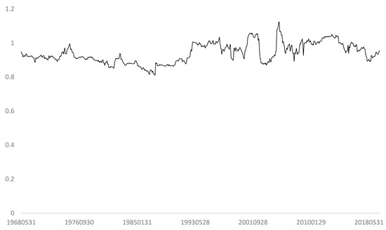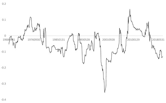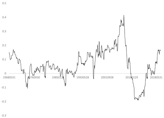 In Figure 2, Figure 3, Figure 4, Figure 5, Figure 6 and Figure 7, we report the time-varying factor exposures based on Fama and French’s six-factor model from July 1968 to November 2020. From casual inspection of Figure 2, we see that the survivor portfolio’s exposure to excess S&P 500 index returns is stable over time with beta close to unity. By contrast, Figure 3 shows that exposure to the size factor increases over time and exhibits noticeable volatility. We infer that, while survivor stocks in the S&P 500 index are large companies, as time passes, these companies become smaller with respect to this market index. This intertemporal pattern is consistent with Taleb (2012), who observed that “… in spite of what is studied in business schools concerning ‘economics of scale’, size hurts you at times of stress; it is not a good idea to be large during difficult times.” (Taleb 2012, p. 279). Even though survivor companies engaged in mergers and acquisitions over time (Siegel and Schwartz 2006), our findings suggest that survivor companies grew smaller in size relative to the S&P 500 index in general. Visual inspection of Figure 2 shows a clear linear trend of the survivor stock portfolio’s exposure against the size factor, which reaches its peak in May 2007. This peak occurred shortly before the early phase of the financial crisis starting in the beginning of August 2007 with the seizure in the banking system precipitated by BNP Paribas announcing that it was ceasing activity in three hedge funds operating with U.S. mortgage debt. When stock prices collapsed in the wake of the financial crisis, the market capitalization of those firms remained relatively stable. This pattern is implied by the sharp decrease from a positive exposure against the size factor in May 2007 until reaching its minimum with the economically largest negative exposure against the size factor in May 2012. A similar pattern can be seen after the stock market crises of 1972, 1987, and 1997. From an investment point of view, this finding suggests that survivor stocks may serve as safe havens in times of turmoil because their market capitalizations increase relative to the S&P 500.