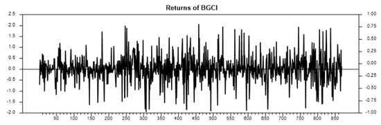 Table 6 further identifies the connectedness in terms of volatility. The BGCI had a stronger positive power in explaining the S&P500 (0.1773) than the S&P500 to explain the BGCI (0.028), inferring that there is asymmetrical volatility transmission between the BGCI and S&P500. Both markets contributed explanatory power in explaining the volatility transmission to each other. Our results are robust to volatility transmission.