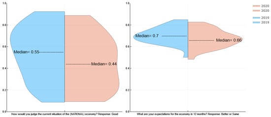 In Figure 1, we illustrate our two dependent variables in our models. Indeed, we show across all i EU countries for Question 1 and Question 4. Some facts stand-out: (i) in the left- and right-panel of Figure 1 the economic assessment in 2020 is lower than in 2019 in general. Of course this is caused by the Corona pandemic in 2020. (ii) the median drops from to in the left-panel, which is more than in the right-panel. This implies that people downgrade the current economic situation far more than the economic expectations in 12 months. (iii) the range in the left panel between is greater than in the right-panel of . That pattern is somewhat surprising. Yet, there exists psychological and evolutionary biological evidence that human beings form more optimistic and homogenous beliefs about the future (see literature review (Hecht 2013)). Consequently, the range of the future economic prospect is narrow and more positive than the current economic evaluation.