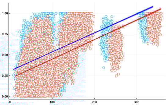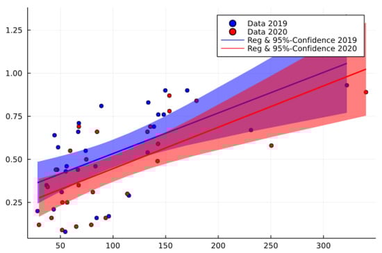 Simulation Regression: The blue color represents the simulation of the scatter and regression line with 99% confidence interval of the 2019 data. The red color represents the simulation of the scatter and regression line with 99% confidence interval of the 2020 data. Source: author.
