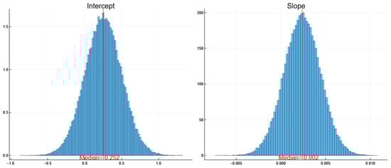 Finally, we re-simulate the model with a sample size of N = 100,000. Figure 4 show all possible bi-variate regression models consisting of Question 4 and GDP per capita. Indeed, Figure 4 exhibits the histograms of the intercepts in the left-panel and the slopes in the right-panel. The median values reflect the estimation outcomes of Panel 1 in Table 4.