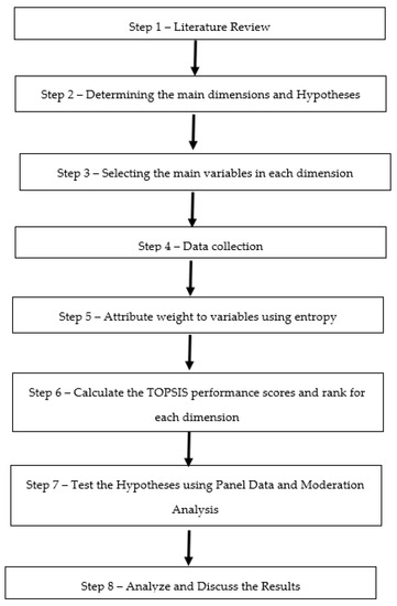 Due to the multi-criteria nature of dimensions, we adopted a Multi-Criteria Decision Analysis (MCDA) approach using the TOPSIS method. The MCDA method has been extensively used and modified in literature (See Mukhametzyanov 2021). According to Madi et al. (2016), MCDA consists of two basic approaches: Multiple Attribute Decision Making (MADM) and Multiple Objective Decision Making (MODM). TOPSIS falls in the MADM category, which refers to making a selection in the presence of multiple, usually conflicting, attributes. Hwang and Yoon (1981) introduced the TOPSIS method to facilitate comparing and ranking alternatives (individuals) based on the perceived weight attributed by the decision-maker to a set of criteria relying on two contrasting choices (i.e., the best and worst possible scenarios). TOPSIS ranks the alternatives (i.e., countries in this paper) that simultaneously present the shortest distance from the positive ideal solution (best option) and the farthest distance from the negative (worst) solution (Hwang and Yoon 1981). This method has been used in several studies, for example, by Yorulmaz et al. (2021), who used this method to rank development levels by provinces in Turkey. Entropy considers the amount of information in each criterion (Cover and Thomas 1991) and can be used with TOPSIS to establish the specific weight for the variable. According to the information theory, “the entropy weight represents useful information of the evaluation index. Therefore, the bigger the entropy weight of the index is, the more useful information of the index is” (Li et al. 2011, p. 2087). In that sense, entropy becomes a valuable tool for helping managers decide on the weight of the criteria included in the MCDA approach (Kumar et al. 2021). We used an eight-step method to compute the TOPSIS performance scores and test the hypotheses.