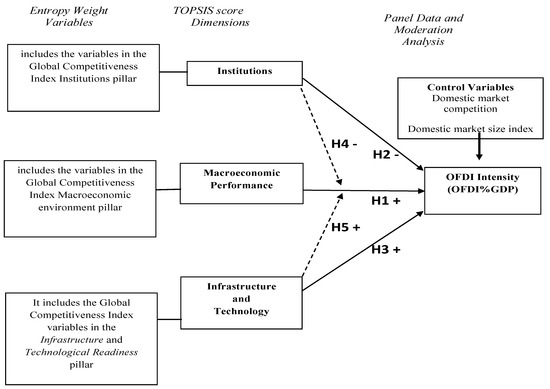 The model in Figure 2 presents the determinants of OFDI in LAC. The entropy method is used to calculate each variable’s weight (importance), followed by TOPSIS to rank the LAC countries in each of the three dimensions. The model indicates that the quality of formal domestic institutions, economic performance, infrastructure and technology provide important incentives to explain the OFDI intensity. Furthermore, the quality of infrastructure and technology moderates positively, while the quality of formal institutions negatively moderates the relationship between macroeconomic performance and the OFDI intensity. We tested these assumptions using multiple regression and moderation analysis.