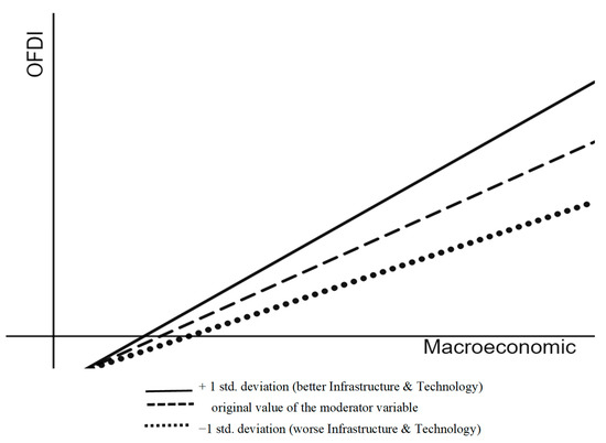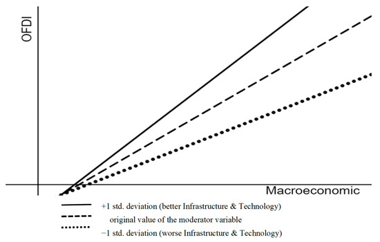 Regarding the moderating effects of infrastructure and technology, the results reveal a positive moderating effect that supports hypothesis H5. The change in the coefficient for the relationship between macroeconomic performance and the OFDI intensity highlights positive moderation, i.e., it increases as the quality of infrastructure and technology improves. The moderation tests show that when infrastructure and technology worsen (i.e., is subtracted by 1 std. deviation), the coefficient for the relationship between macroeconomic performance and OFDI intensity is 2.013 and statistically significant (p-value < 0.01). The tests with the mean value for the moderator variable show that the coefficient for the main relationship remains significant and increases to 2.721 (p-value < 0.01). Finally, when 1 std. deviation is added to the moderator variable, the coefficient for the main relationship increases to 3.429 (p-value < 0.01). Therefore, the changes correspond to adding and subtracting 1 std. deviation to the quality of infrastructure and technology leads to an approximate increase of 70% in the relationship between the macroeconomic performance and LAC’s OFDI intensity. Figure 4 displays the slope of the regression line corresponding to changes in the moderator variable. The slope of the solid line shows that when the quality of infrastructure and technology improves, the OFDI from LAC increases. In contrast, the dotted line indicates that the OFDI intensity in the region is lower in the case of less developed infrastructure and technology. These findings reveal that infrastructure and technology play an essential role in the internationalization of LAC firms via OFDI.