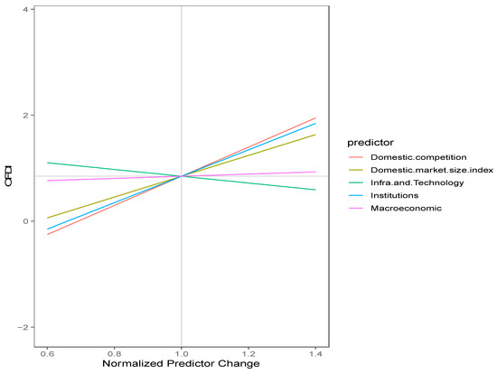 We also conducted a sensitivity analysis for the variables we considered for both models, with and without interactions between macroeconomic and formal institutions and macroeconomic and infrastructure and technology. We aimed to investigate what variable has a more significant impact on the OFDI and the sensitivity of OFDI with the change of each variable when holding other variables constant. The model outputs and their comparison in terms of model coefficients, statistical significance and the associated R squares are displayed in Figure 1. We observe that the inclusion of interaction terms has a significant impact on the model coefficients, suggesting that the OFDIs are sensitive to the changes of all variables when holding other variables constant. The impacts on OFDI interact among the variables. However, Model 1 (the results are reported in the second column of Table 5) did not capture the significant impact of the macroeconomy, while Model 2 (the results are reported in the second column of Table 5) performs much better for both the model predictive power and significant impact from the included variables. Among all the variables we considered in the study, the institutions variable is considered as the most influential and has a significant impact by the covariates: domestic competition and domestic market size. This can be seen from the results presented in Figure 5 and Figure 6. For instance, a 20% increase in TOPSIS scores of the institutions leads to a more than 0.5 increase in OFDIs. The macroeconomic is the least influential variable in explaining the variation of OFDIs. However, the impact from the macroeconomic dimension is also statistically significant based on the results we observe in Figure 6.