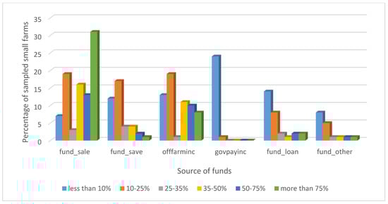 Figure 1 and Panel B of Table 1 present the different sources of funds used by small farms in the US to meet their agricultural spending and expenses. To meet their agricultural spending and expenses, small farmers use sales from their agricultural produce (fund_sale), past savings (fund_save), off-farm income (offfarminc), income from government payments and incentives (govpayinc), and external loan and credits (fund_loan). Figure 1 shows the distribution of sources used to meet farm expenses by small farms. For example, around 30% of sampled farmers (the highest) obtained more than 75% of their funds meeting farm expenses from the sales of their agricultural products, followed by 8% of sampled farms financing 75% or more through off-farm income and past savings. Some other sources of financing for small farms for agricultural expenses came from loans, government payment/incentives, and other sources (Figure 1).