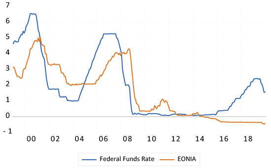 Evolution of Federal Funds Rate and EONIA over the sample period 1999:1–2019:12.