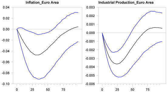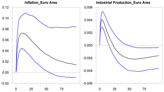 Substantially, we make the same experiment conducted in the previous sections: we first estimate a VAR model in which EONIA is taken as the monetary policy instrument, then we augment the VAR model by adding the Federal Funds Rate and the Euro–Dollar exchange rate. Results are shown, respectively, in Figure 5 and Figure 6. Indeed, Figure 5 shows that in response to a monetary tightening, there is an increase in both inflation and industrial production. The rise in inflation is statistically-significant for around four years, while the rise in industrial production lasts for around two years. Hence, a specification of the VAR model treating the Euro Area as a closed economy confirms the wrong signs of both inflation and aggregate output in response to monetary policy shocks.