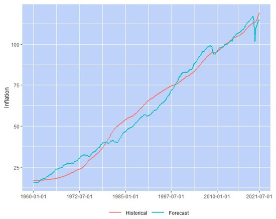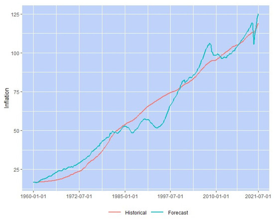 The RMSE of our model’s inflation forecast is 7.7635, while the naive model RMSE is 15.9713. The ratio of our model’s RMSE to the naive model RMSE is 0.4861, while the ratio in Atkeson and Ohanian (2001) is 1.88. This means that our forecasting error is more than 50% lower than that derived by the naive forecasting model. Our mean absolute percentage error is 0.81%, while the time-lagged model has an error of 1.90%. This indicates that our holistic model maps the real data over 100% more accurately than the naive model proposed by Atkeson and Ohanian (2001).