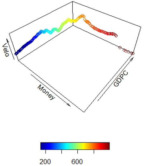 The plot of historic data of the quantity of money, the velocity of money, GDP and GDP deflator shown in Figure 3, as well as the three-dimensional graph in Figure 4, illustrating the results of our ceteris paribus analysis, show how the GDP primarily drives the level of inflation. An increase in the quantity of money historically supports the creation of inflation, but fails to gain support in general when holding a holistic inflation perspective.