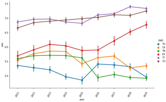 For Citizen Participation (TG), the mean of this variable is 5.20 points, and the standard deviation is 0.49 points, indicating a relatively low level of volatility in TG. For Publicity and Transparency in Decision Making (CK), the mean of this variable is 5.60 points, and the standard deviation is 0.50 points, indicating that the volatility of CK is relatively low. For Citizens Accountability (TN), the mean of this variable is 5.36 points, and the standard deviation is 0.57 points, indicating a relatively low level of TN volatility. For the Control of Corruption in the Public Sector (KS), the mean of this variable is 6.12 points, and the standard deviation is 0.66 points, indicating a relatively low degree of KS volatility. For Public Administration Procedures (TT), the mean value of this variable is 7.06 points, and the standard deviation is 0.33 points, showing that the volatility of TT is relatively low. For Public Service Delivery (CU), the mean value of this variable is 6.98 points, and the standard deviation is 0.36 points, indicating a relatively low level of CU volatility. The fluctuation over the years of the components in the quality of public administration is presented in Figure 1.